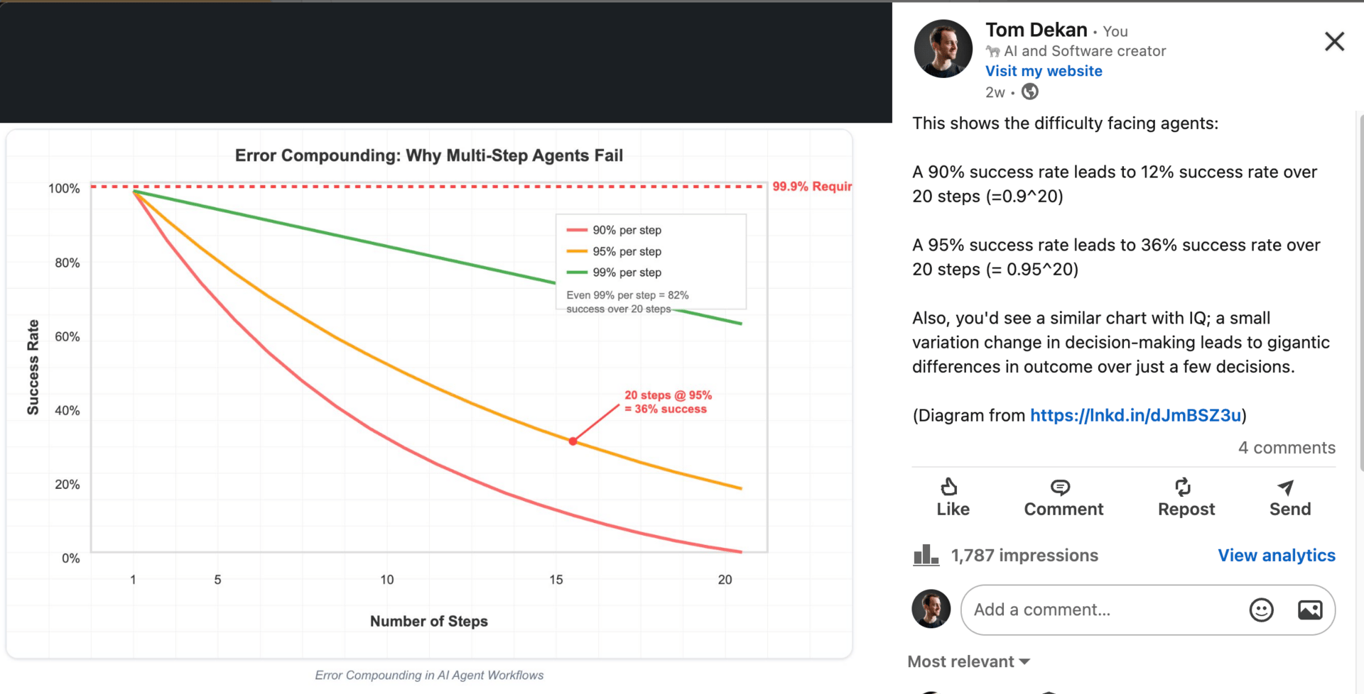 You need a very high accuracy rate to succeed over a multi-step process. E.g., 99.9% is much better; over 20 steps, you get 98% (0.999 ^ 20)